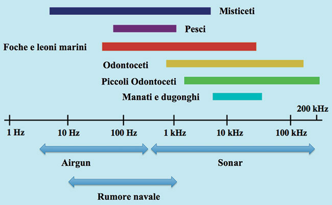 Confronto tra le frequenze sonore dei cetacei e quelle prodotte dalle sorgenti antropiche in ambiente marino. Si nota come il rumore umano tenda a sovrapporsi con i suoni impiegati dai mammiferi marini per la loro sopravvivenza (IFAW 2008)