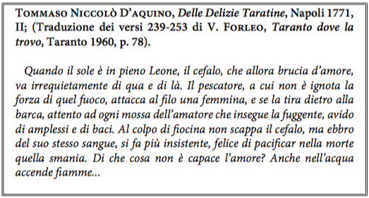 Il punto di svolta nella tradizione letteraria alieutica locale è segnato dal poeta arcade Tommaso Niccolò d’Aquino, che nel II libro delle Deliciae Tarentinae (anch’esso in esametri latini) si rifà alla pesca assidua dei tarantini descritta da Giovan Giovine, e dal suo commentatore Cataldantonio Carducci Artenisio, nobile tarantino, curatore della prima edizione del poema del d’Aquino, nel 1771. Il Carducci, che dedica ben 16 anni al Commentario alle Delizie Tarantine con assidui contatti col naturalista calabrese padre Antonio Maria Minasi (che lo avvia alla classificazione linneana), commenta e traduce in ottave gli esametri del d’Aquino, senza una organizzazione sistematica ma con una trattazione che riflette, in chiave esegetica, il testo poetico. Così, solo per fare un esempio, nella lunga trattazione della palamita, il Carducci ne rivendica l’appartenenza a una specie diversa da quella dei tonni, dice che i palamiti sono compagni dei tonni e sviluppa tutta una articolata serie di notizie volendo trattare dei pesci tipo, genere, economia, vita e lunghi viaggi. Rispetto alla tradizione pregressa, con il Carducci Artenisio c’è, dunque, un salto netto perché ora nell’opera di impianto letterario si innesta una istanza scientifica propria della migliore cultura illuministica.