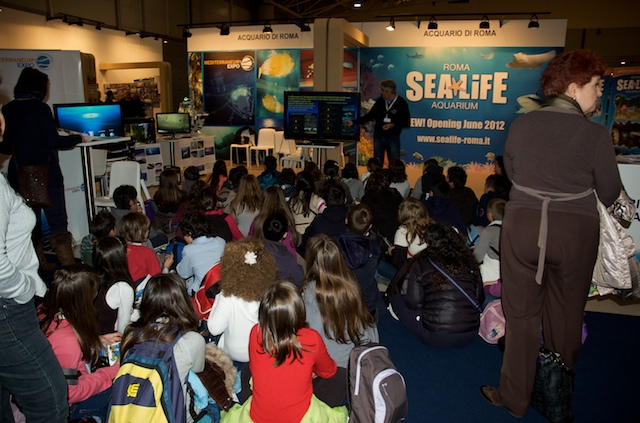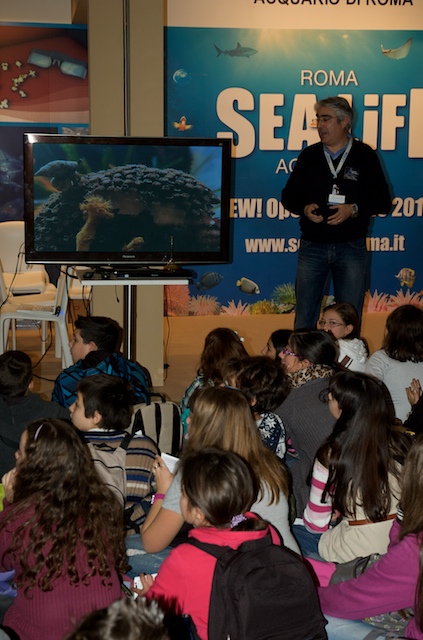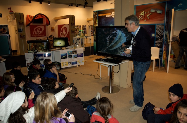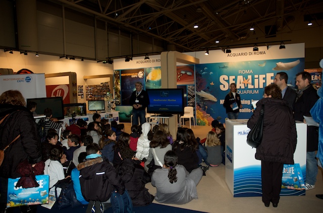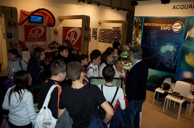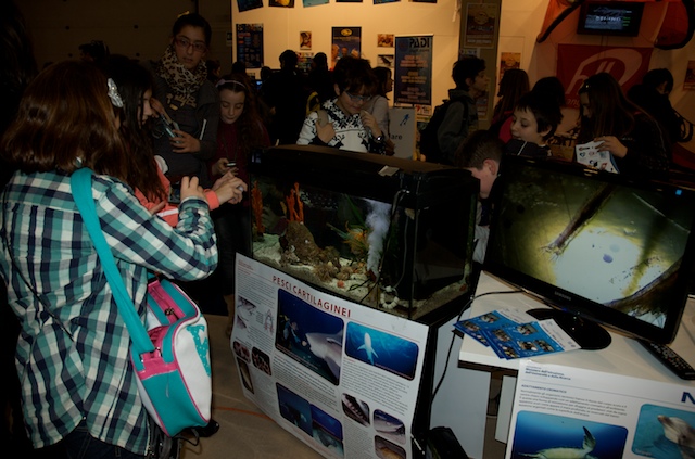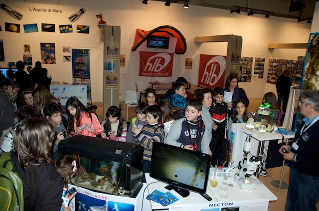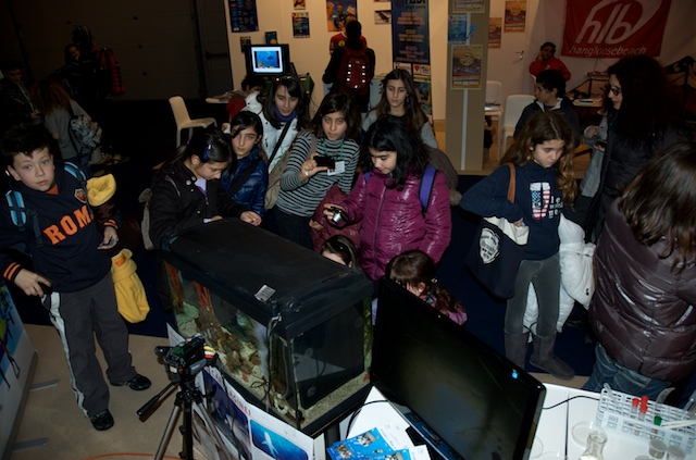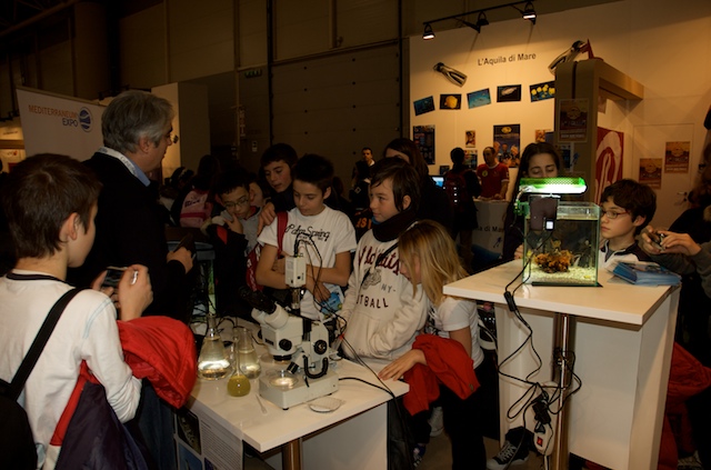 Per molti visitatori è stato possibile toccare e scoprire ciò che in mare comunemente guardiamo ma troppo spesso non vediamo. Grazie ad alcuni campioni di substrato colonizzato, prelevati dal mare di Taranto e opportunamente portati alla Fiera di Roma, è stato possibile osservare da vicino l’incredibile biodiversità che si nasconde nei fondali del nostro mare e toccare gli organismi che costituiscono lo “strato vitale” dei nostri fondali per comprenderne il ruolo ecologico e l’importanza fondamentale per la sopravvivenza della vita di tutta la Terra. Tra le tante specie marine presenti nel sorprendente acquario preparato per il salone nautico, il plancton, il primo anello della catena alimentare di cui si nutrono gli abitanti del mare, ha attirato l’attenzione di tanti piccoli visitatori.