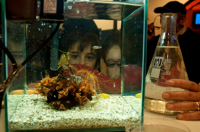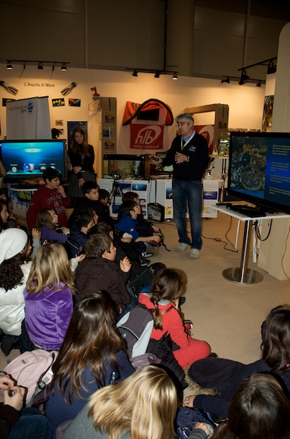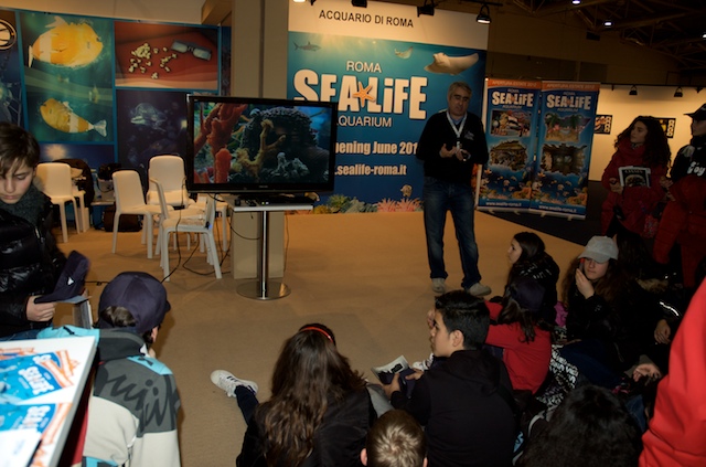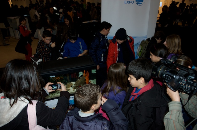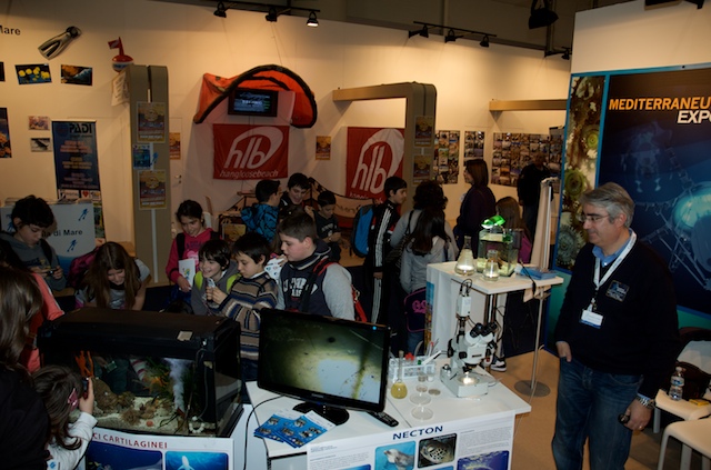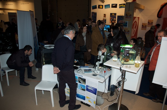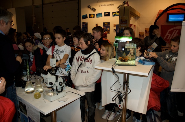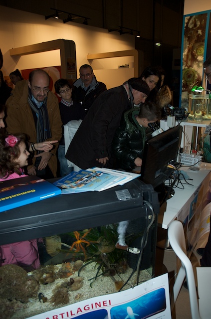 Per molti visitatori è stato possibile toccare e scoprire ciò che in mare comunemente guardiamo ma troppo spesso non vediamo. Grazie ad alcuni campioni di substrato colonizzato, prelevati dal mare di Taranto e opportunamente portati alla Fiera di Roma, è stato possibile osservare da vicino l’incredibile biodiversità che si nasconde nei fondali del nostro mare e toccare gli organismi che costituiscono lo “strato vitale” dei nostri fondali per comprenderne il ruolo ecologico e l’importanza fondamentale per la sopravvivenza della vita di tutta la Terra. Tra le tante specie marine presenti nel sorprendente acquario preparato per il salone nautico, il plancton, il primo anello della catena alimentare di cui si nutrono gli abitanti del mare, ha attirato l’attenzione di tanti piccoli visitatori.