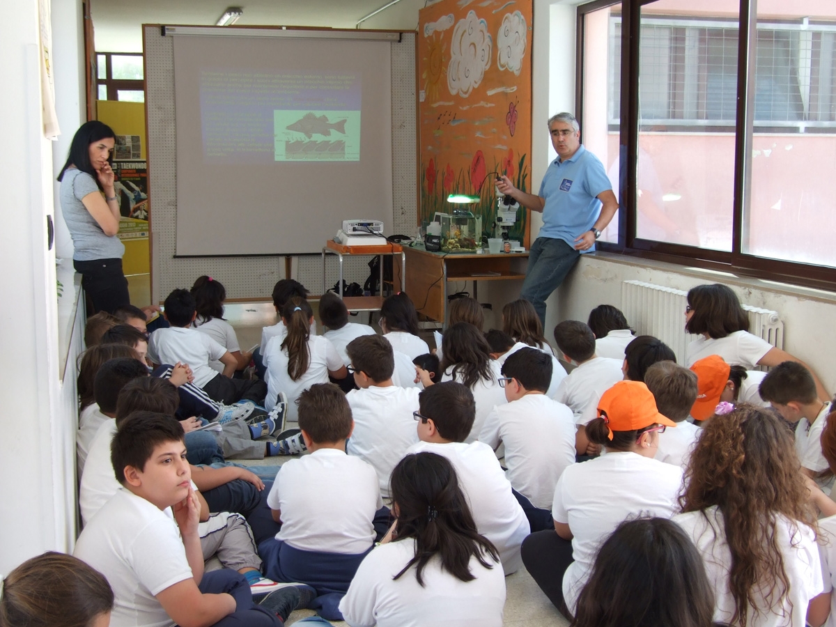 Lungo il viaggio alla conoscenza del mare, filmati, esperimenti, acquario, hanno condotto i ragazzi alla conoscenza dell’ambiente marino mediterraneo. Con l’aiuto di un piccolo acquario didattico, di una videocamera, di uno stereomicroscopio e un proiettore gli alunni hanno esplorato i fondali dell’acquario e proiettati su grande schermo hanno conoasciuto da vicino i pesci, le spugne, gli anemoni, gli spirografi, i crostacei, le stelle marine, i molluschi, i coralli. Il biologo marino Luigi Esposito ha mostrato i microorganismi del plancton e ha parlato di catena alimentare dal vivo dando il cibo agli organismi dell’acquario: il fitoplancton per le spugne, lo zooplancton per i coralli, anfipodi e gamberi per i pesci. La conoscenza del mare è avvenuta anche attraverso il contatto con gli organismi marini vivi: stelle marine, ricci e molluschi, conchiglie, rizomi e foglie di posidonia. Infine sabbia e gusci di molluschi ma anche pezzi di plastica, palline di catrame e tappi, hanno introdotto l’argomento dell’inquinamento marino.